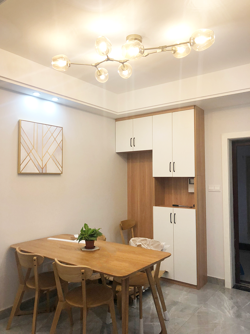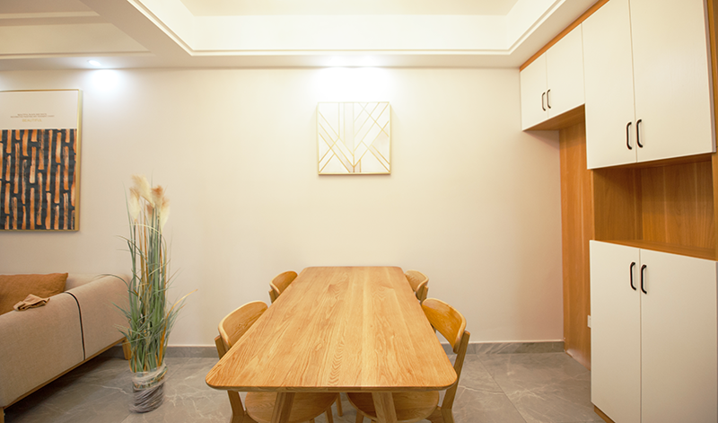 ▲原木餐桌來自我們引進(jìn)的整裝品牌—意羅尼家居,配上掛畫,柔和的燈光更為空間增添了些許魅力。