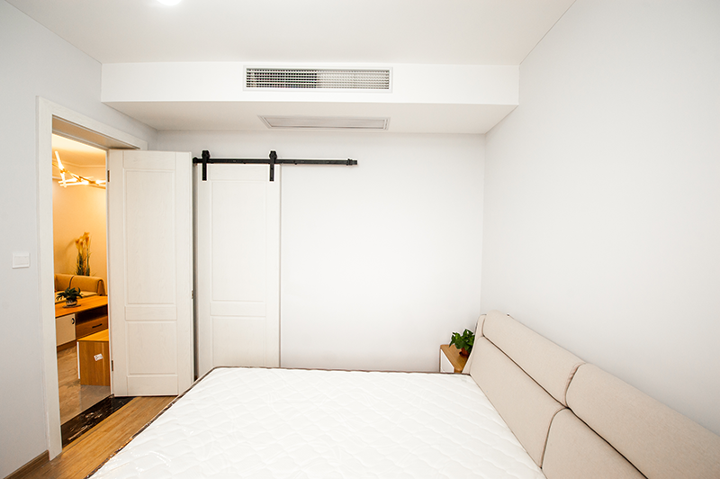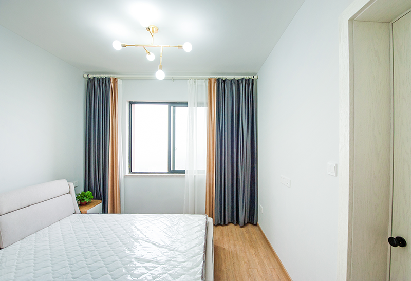 ▲臥室門是隱形門的設(shè)計,與墻面融為一體。主臥的配置比較簡單,原木色與白色相搭的床頭柜, 藍(lán)與黃的窗簾色彩,與家里各個角落都能融合的恰到好處。