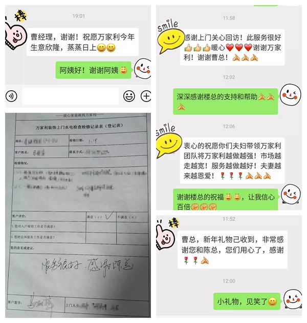 萬(wàn)家利裝飾 1月感恩水電檢修月火熱進(jìn)行中 小伙伴們馬不停蹄 奔波在金華各大小區(qū) 為客戶上門檢修水電 用心的服務(wù) 也換來(lái)了客戶滿滿的好評(píng)! ![]() ▲客戶好評(píng)部分截圖