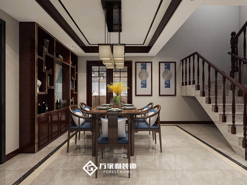 深木色是中式里比較常規(guī)的元素,這種色調(diào)與質(zhì)感更能彰顯主人的穩(wěn)重氣質(zhì), 軟裝配飾用亮色點(diǎn)綴,舒緩了中式莊重感,營(yíng)造出舒適的就餐氛圍。