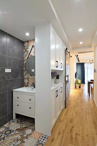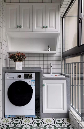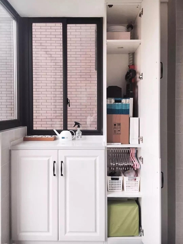 最后要說(shuō)的就是陽(yáng)臺(tái)了,現(xiàn)在大部分的屋主都喜歡把陽(yáng)臺(tái)作為洗衣房來(lái)使用,洗手臺(tái)和吊柜都是并不可少的,雖然空間不大,但也能放些零碎雜物。