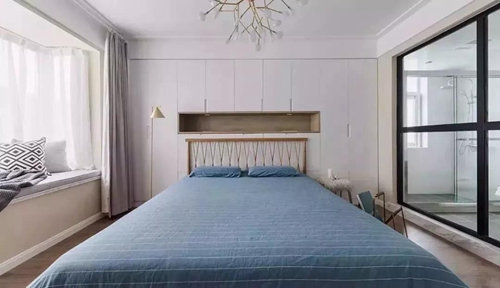 床頭背景墻也可以改成收納款的,柜子和粱平齊,也避免了橫梁壓頂?shù)膯?wèn)題,留出一些開(kāi)放式的空間,方便擺放常用的物品。