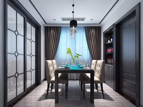 方形餐桌,搭配皮質(zhì)餐椅,餐桌上方掛上造型別致吊燈,設(shè)計感和品位十足。 餐邊柜充分利用了現(xiàn)有空間并提升了家中的物品收納能力,實(shí)用方便。