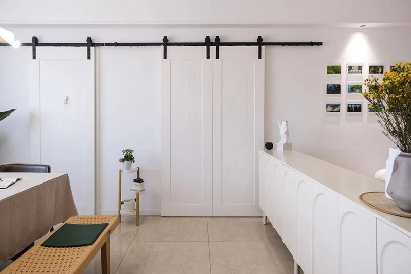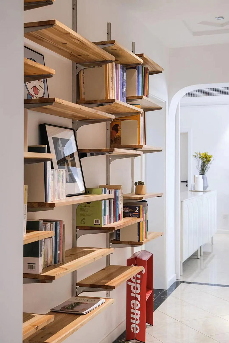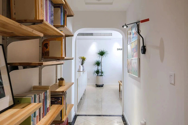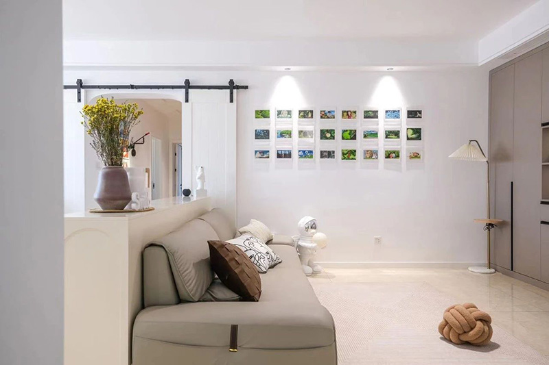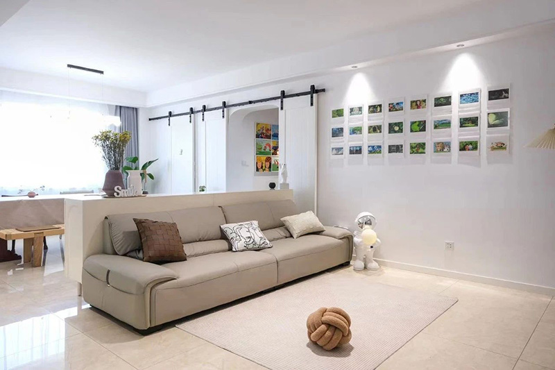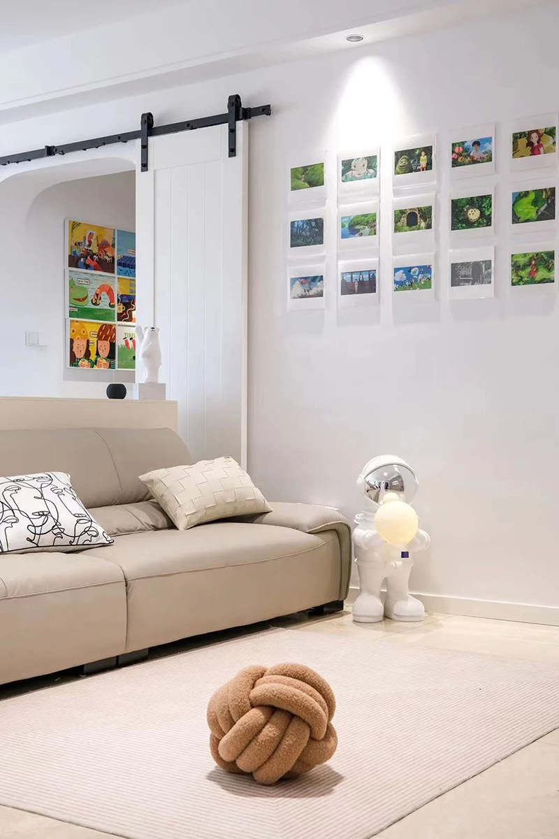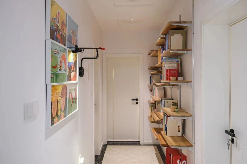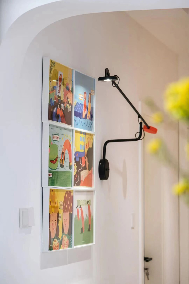 興趣博物館:美是基礎(chǔ),而功能才是空間中的高級(jí)表達(dá)。實(shí)用主義的思維已經(jīng)滲透到每個(gè)角落,餐邊矮柜與沙發(fā)依靠,形成和諧的完整收納,建立了一個(gè)活躍的視覺聯(lián)系,隨著邊上的谷倉(cāng)門緩緩開啟,燈光聚焦在一幅幅色彩鮮明的兒童畫上與客廳側(cè)邊的琳瑯滿目的宮崎駿漫畫墻進(jìn)行了一種非常生動(dòng)活潑的互動(dòng),酷似一個(gè)迷你博物館,陳列著業(yè)主的興趣、審美以及愛與回憶。
