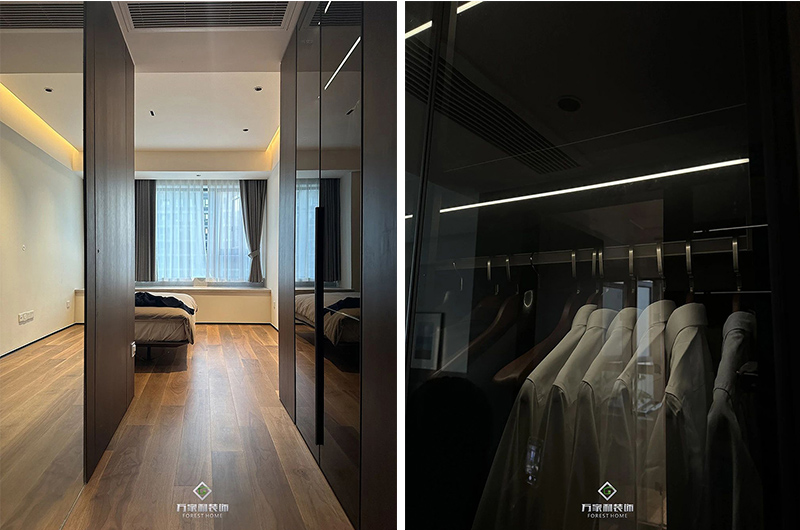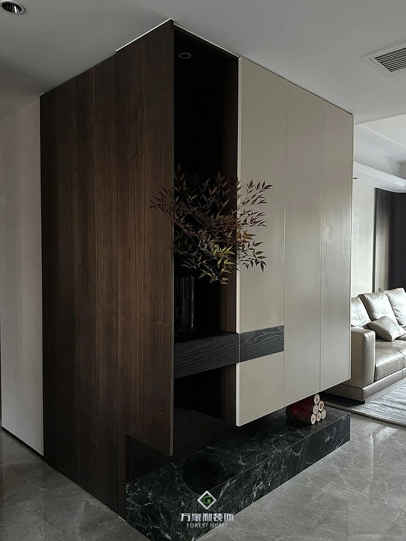 入戶玄關(guān),深色的胡桃木和高級灰的地磚將目光吸引,營造出一種沉穩(wěn)的時尚感。空間簡潔,追求整體畫面的流暢與優(yōu)雅。