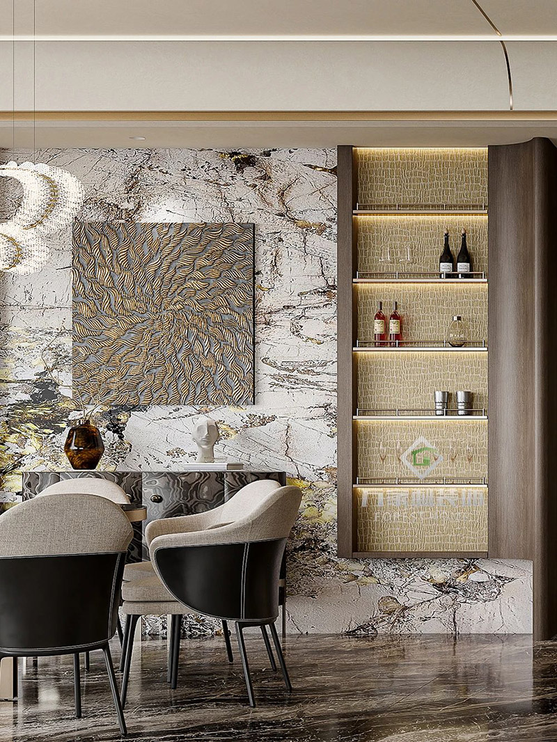經(jīng)典高奢質(zhì)感與現(xiàn)代主義相結(jié)合,更注重空間的內(nèi)斂的奢華和神秘。整體呈現(xiàn)空間的質(zhì)感和層次感,內(nèi)斂布高級,暖調(diào)燈光賦予空間沉穩(wěn)氣質(zhì),力求風(fēng)格統(tǒng)一,彰顯干凈整潔而高級。