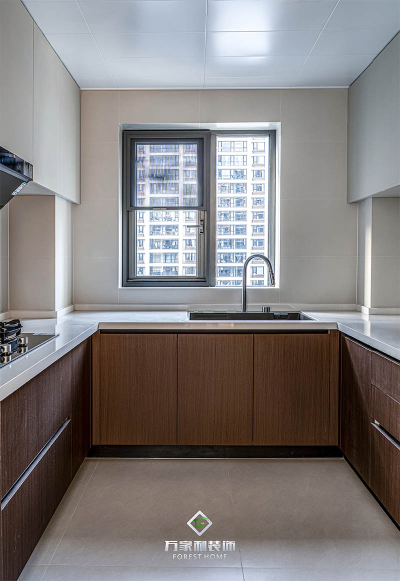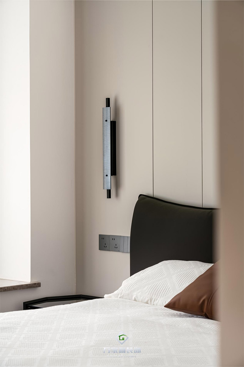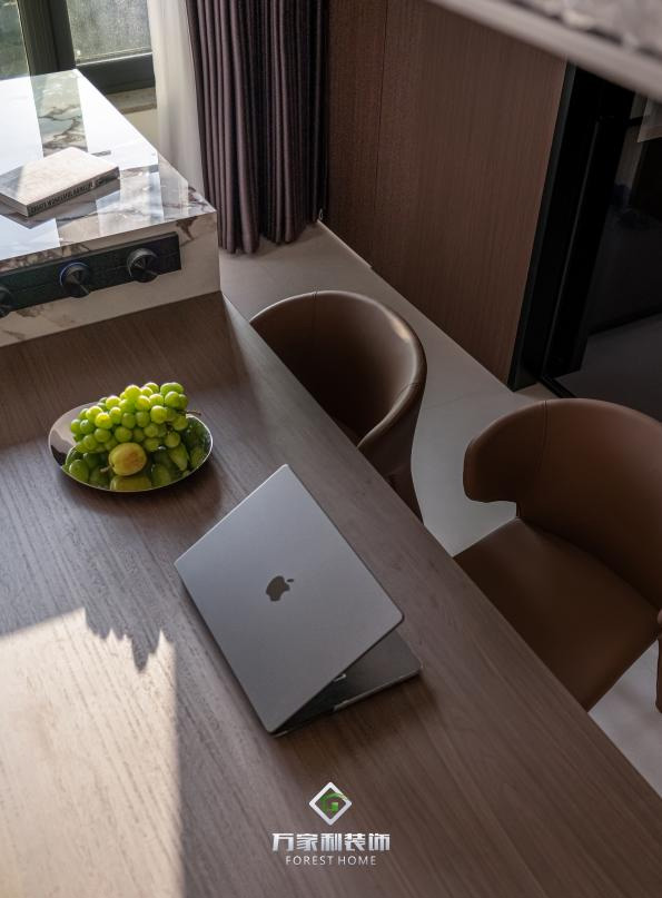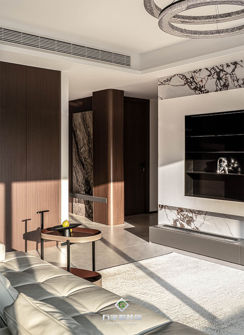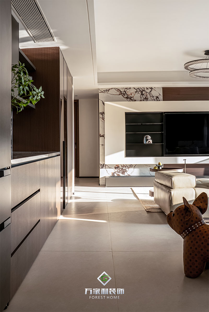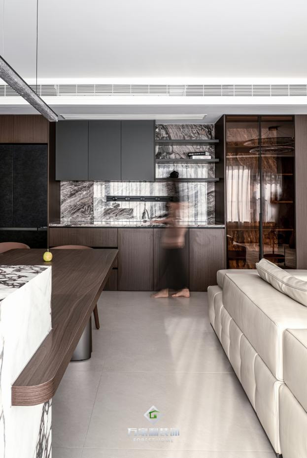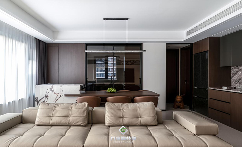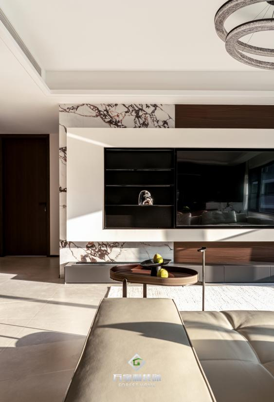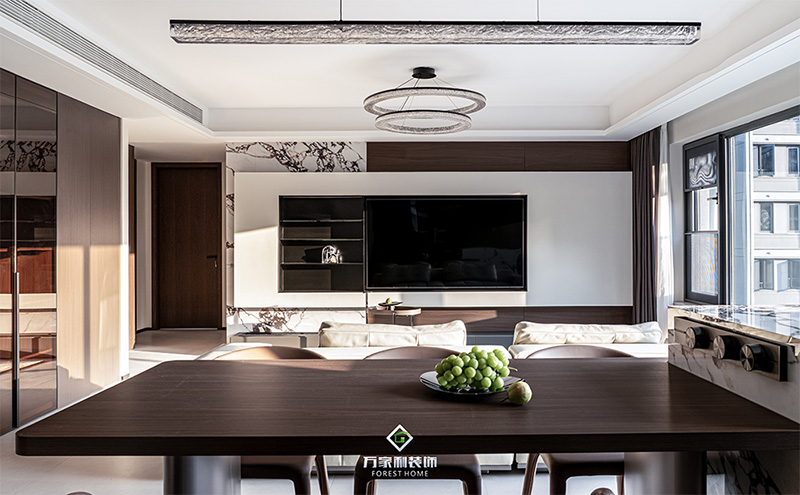客餐廳相連同,擴大客廳的活動空間,在保證足夠儲物功能的情況下,還可以提高視覺效果,電視背景采用寶格麗巖板胡桃木色硬包飾面,突顯巖板的材質與質感內(nèi)嵌黑色不銹鋼電視柜與線形燈結合,讓整體更為整潔,增加舒適感。