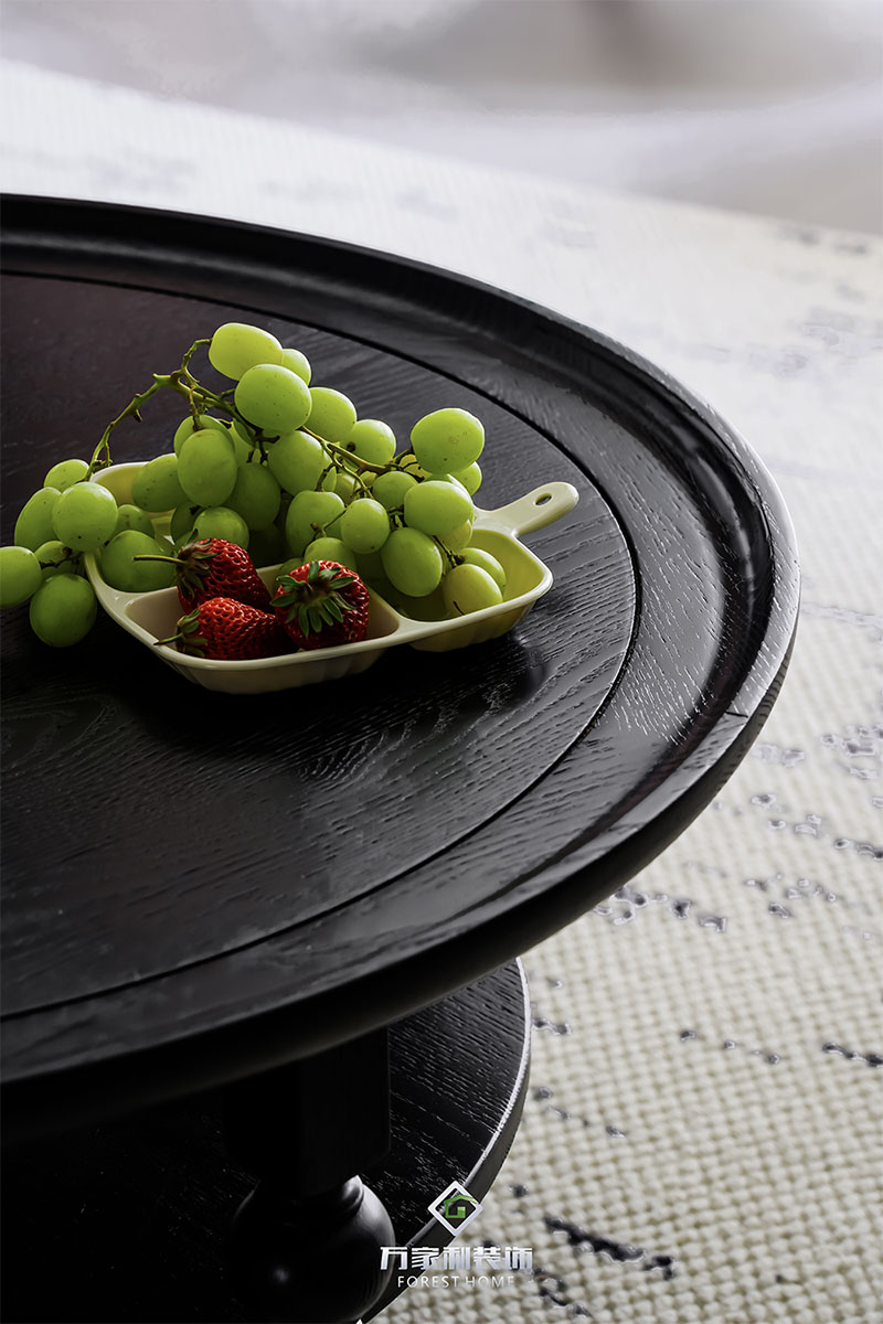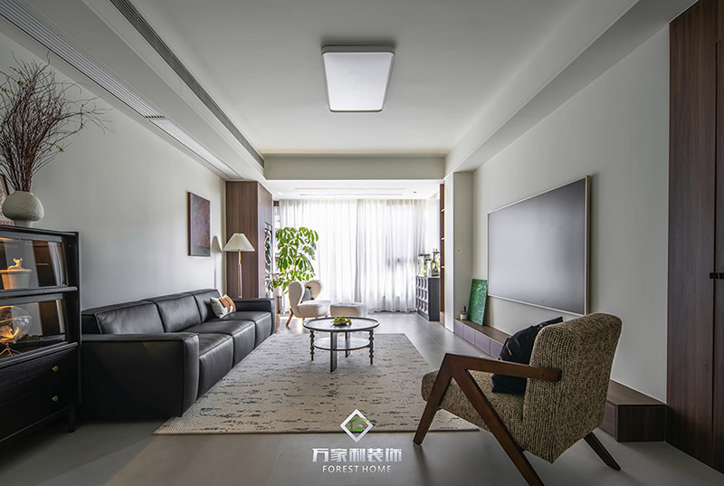 客廳中,經(jīng)典的黑色皮沙發(fā)與木質(zhì)裝飾相映成趣,既有復古的厚重感,又不失現(xiàn)代的舒適。