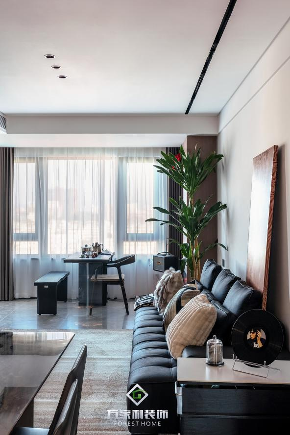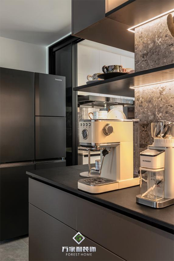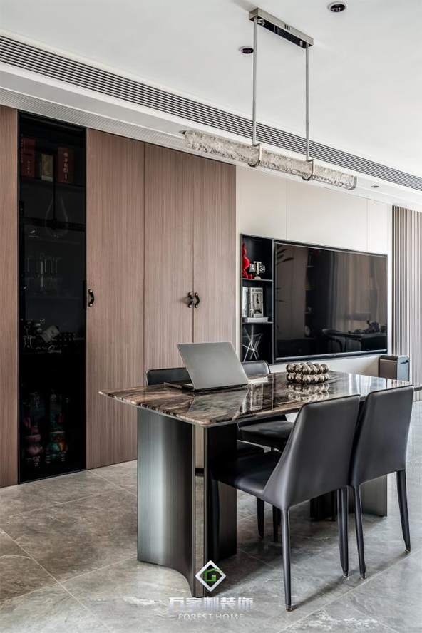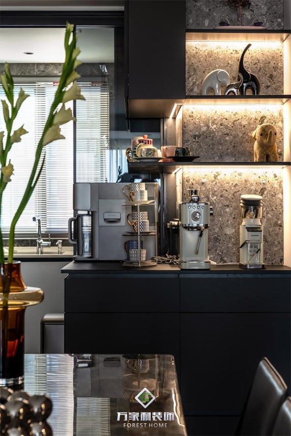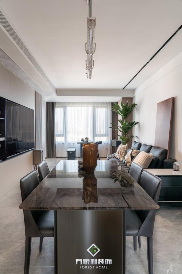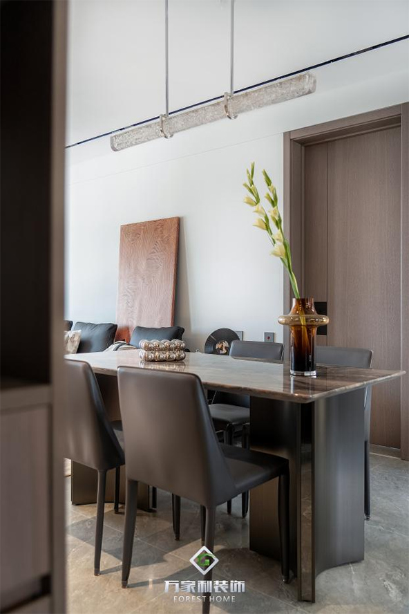 餐廳與客廳相連,開放式的布局讓空間顯得更加寬敞。黑色的餐桌搭配簡約的餐椅,每一處都透露著意式的簡約與時尚。上方獨特的吊燈,就像夜空中閃爍的星星,為用餐時光增添了幾分浪漫的氛圍。