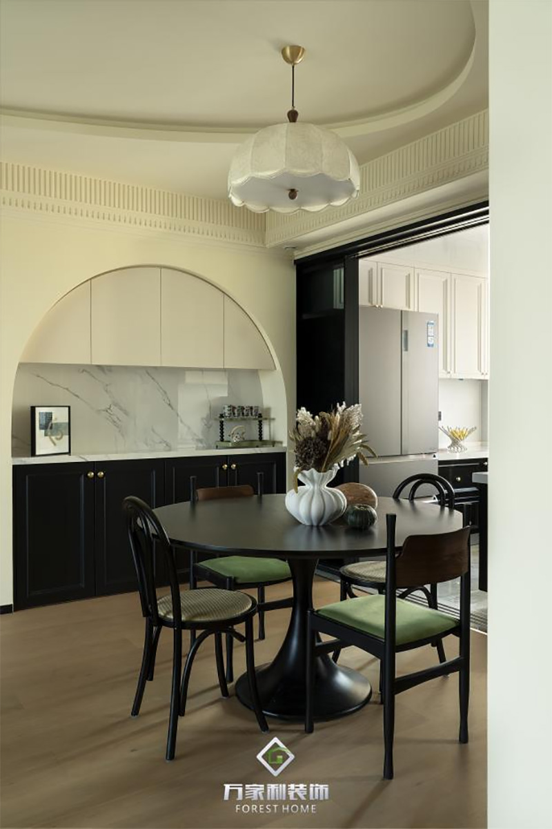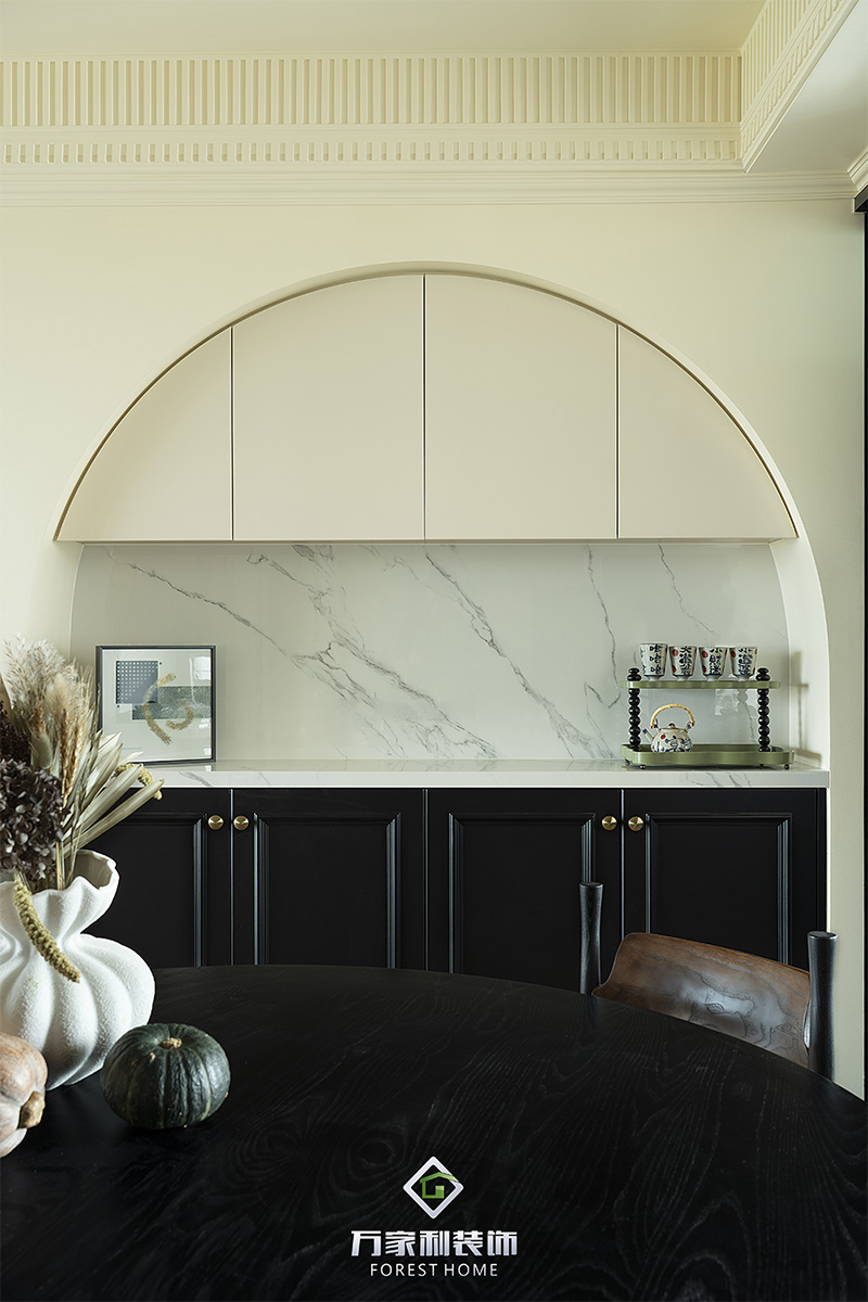 每個(gè)角度都在上演赫本式黑白電影,餐邊柜中間拱形設(shè)計(jì)成為主要亮點(diǎn),搭配獨(dú)特的寶格麗臺面巖板,這不是家具,這是穿越時(shí)空的浪漫藝術(shù)裝置。