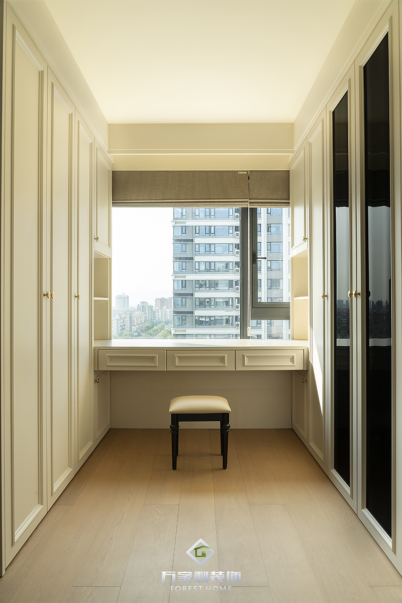 超大衣帽間是多少女孩的夢想,兩組通頂大衣柜+懸空書桌,長虹玻璃柜門透出包包首飾的輪廓。