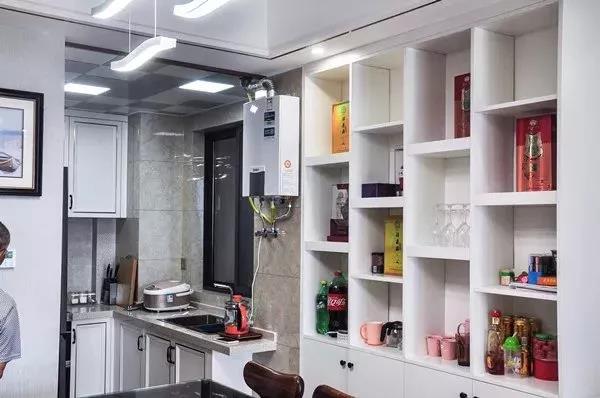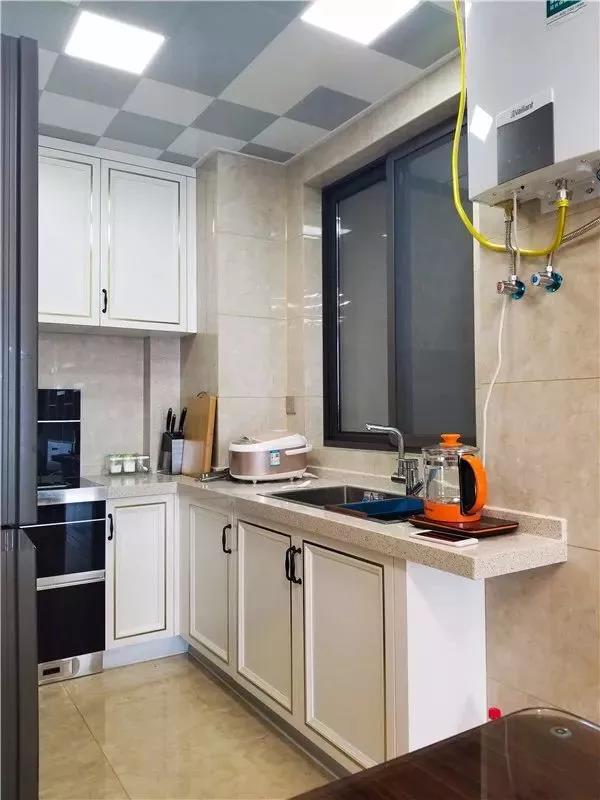 通過改造,設(shè)計(jì)師將廚房門開在了餐廳區(qū)域,在廚房和入戶之間設(shè)計(jì)了鞋柜和冰箱空間,既滿足了鞋柜的儲物功能,又放下了冰箱。 不大的廚房竟然也容納下了L型的櫥柜、冰箱、熱水器。 業(yè)家的柜子是全屋定制的,白色柜體搭配金色線條柜門,和客廳相呼應(yīng),效果美美噠! 米色的大理石臺面,也豐富了空間的層次感。